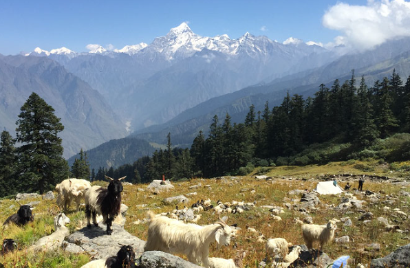 As we climb, we’re greeted with stunning views of snow-capped peaks, including Nanda Devi, Dronagiri, and Hathi Ghoda.