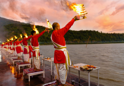Ganga Aarti: A spiritual experience at Triveni Ghat, witnessing the mesmerizing evening prayer ceremony along the Ganges.
